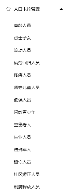 人口卡片管理 本模块包括卡片菜单和操作两部分功能 。 1.卡片菜单 人员卡片主要是对人员的详细信息进行展示,包括烈士子女、残疾人员、留守儿童等信息。 2.操作 实现卡片菜单的迅速更新,添加 本模块包括卡片菜单和操作两部分功能。 1.卡片菜单人员卡片主要是对人员的详细信息进行展示,包括烈士子女、残疾人员、留守儿童等信息。2.操作实现卡片菜单的迅速更新,添加、删除、编辑情况及时管理。